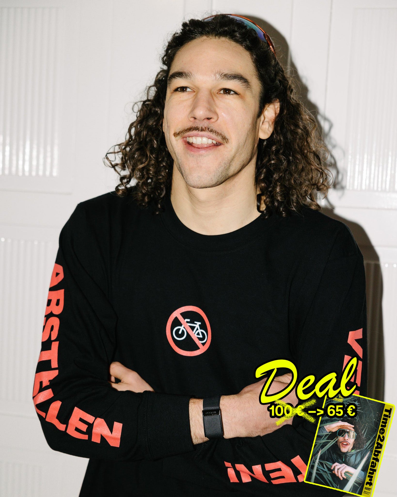 No bikes please! Abstellen Verboten Longsleeve with 4 prints on heavy organic cotton with a loose fit. Printed in Germany. 110% Bike street style.